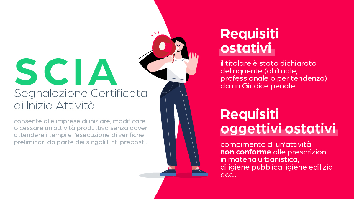 Ci possono essere quindi degli impedimenti, detti “requisiti ostativi” che impediscono ad una SCIA di andare a buon fine. Ad esempio, un requisito ostativo si riscontra quando il titolare è stato dichiarato delinquente (abituale, professionale o per tendenza) da un Giudice penale. Oppure, quando ha riportato una sentenza penale di condanna passata in giudicato per un delitto non colposo per il quale è prevista una pena detentiva non inferiore nel minimo a 3 anni di reclusione. Un requisito oggettivo ostativo potrebbe essere invece il compimento di un’attività non conforme alle prescrizioni in materia urbanistica, di igiene pubblica, igiene edilizia, tutela ambientale, tutela della salute nei luoghi di lavoro, sicurezza alimentare, regolamenti locali di polizia urbana...