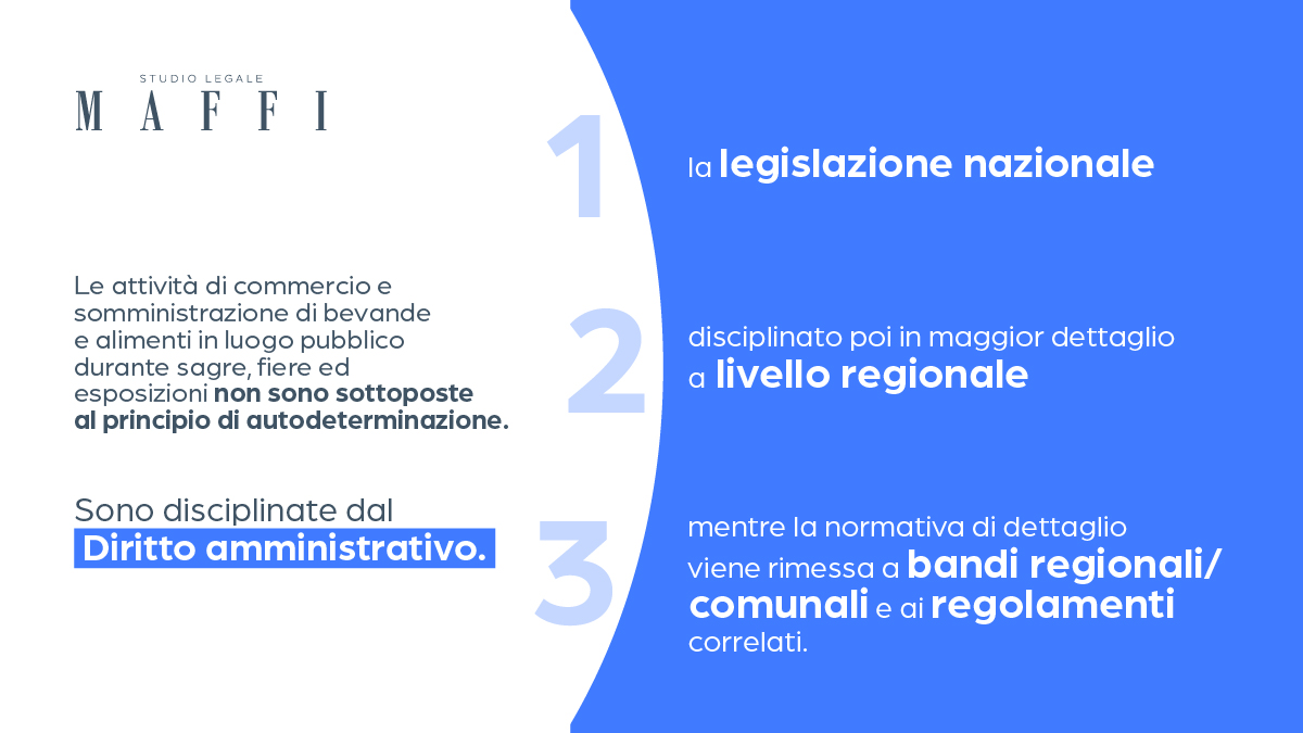 Prima di vedere insieme che cosa dice la legge sulla scia per sagre, è bene comprendere un punto focale al fine d’inquadrare correttamente la questione. Le attività di commercio e somministrazione di bevande e alimenti in luogo pubblico durante sagre, fiere ed esposizioni non sono sottoposte al principio di autodeterminazione tipico di qualsiasi attività privata svolta in piena autonomia. Ciò cosa significa? Significa che queste attività, proprio in quanto si svolgono in modalità temporanea e durante un contesto specifico, implicano il coinvolgimento di interessi pubblicistici. Ragion per cui, queste non possono essere disciplinate dal Diritto civile, bensì dal Diritto amministrativo. Una branca della Legge di cui lo Studio Legale Maffi si occupa da anni, con relativa esperienza sulla normativa in essere.