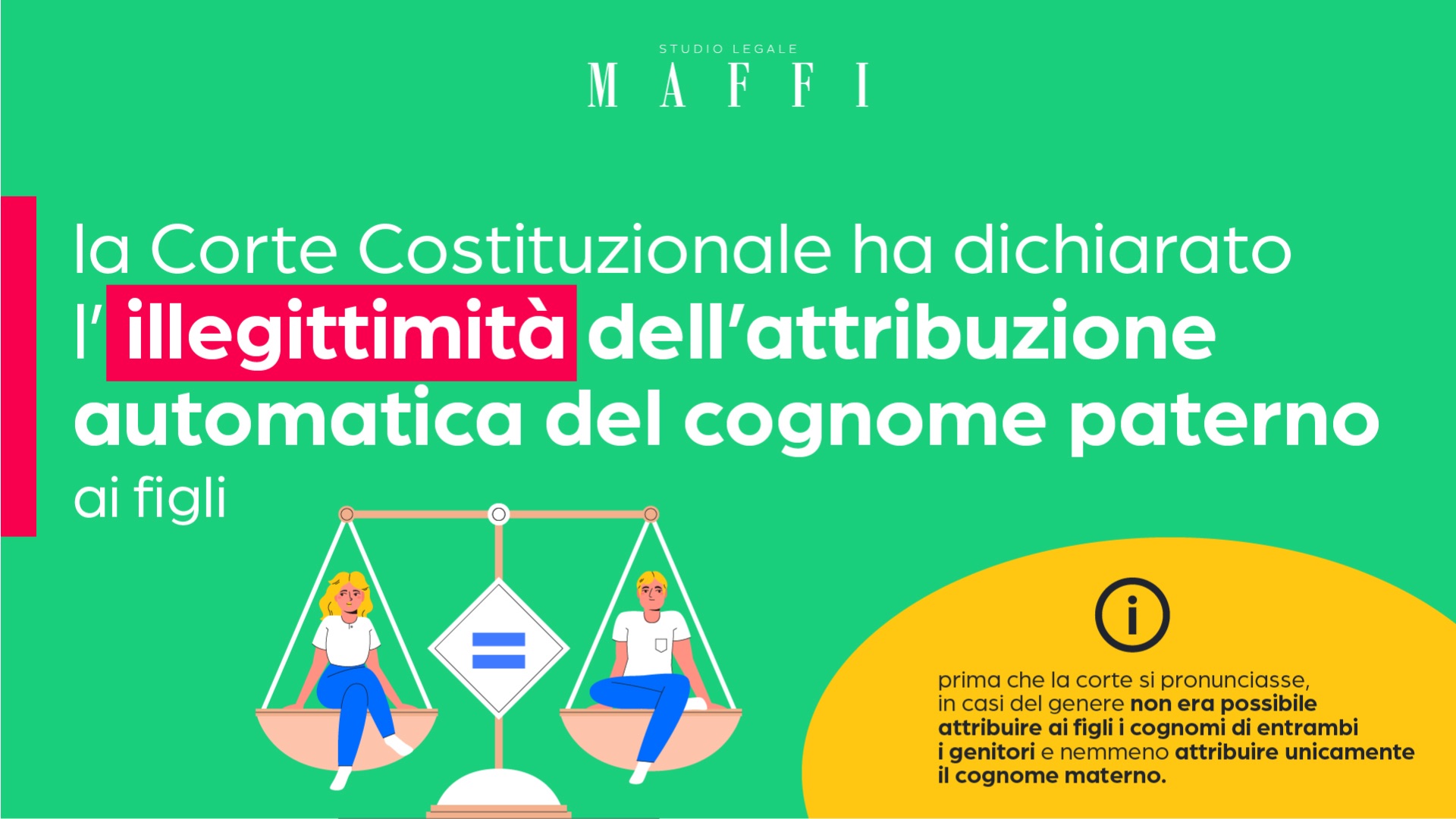 Il 27 aprile 2022 la Corte Costituzionale ha dichiarato l’illegittimità dell’attribuzione automatica del cognome paterno ai figli. La notizia si è subito diffusa su media e social media, generando dibattito e accendendo polemiche. In molti hanno presentato la vicenda come un importante traguardo nel cammino verso la parità di genere. Lo Studio Legale Maffi desidera aiutare a fare chiarezza su quanto dichiarato dalla Corte e sulle implicazioni pratiche di questa storica sentenza. Prima di tutto, è bene comprendere con esattezza in quali termini si è pronunciata la Corte.