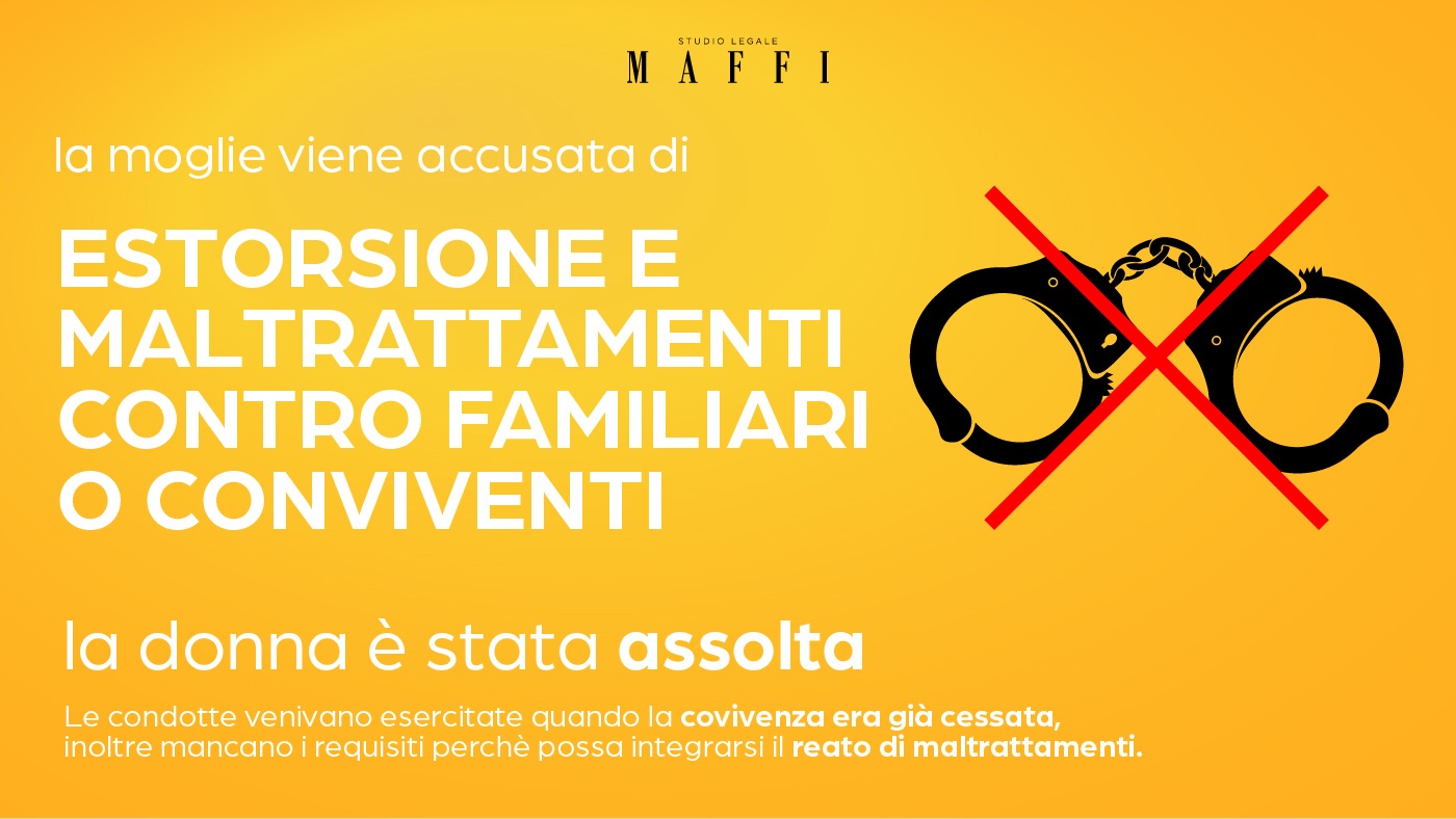 La donna sarà invece assolta in ordine al reato di cui all’art. 572 del Codice Penale, in quanto le condotte venivano esercitate quando la convivenza tra le due parti era già cessata. È bene specificare che i due non avevano alcun rapporto di solidarietà, il tutto si basava unicamente su un accordo (matrimonio di convenienza). Mancano quindi i requisiti perché possa integrarsi il reato di maltrattamenti in famiglia.